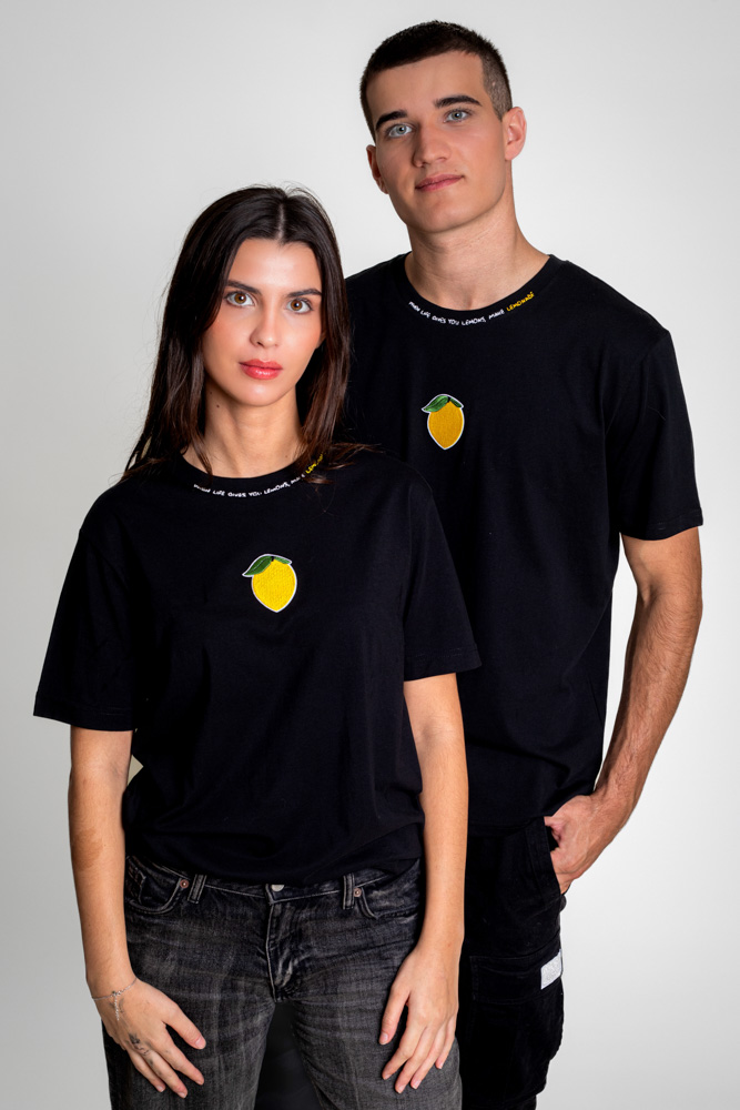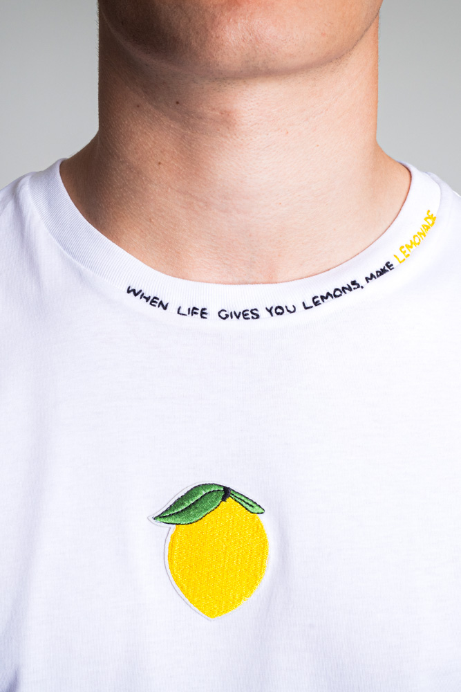• “WHEN LIFE GIVES YOU LEMONS, MAKE LEMONADE” hand-embroidered phrase on the collar,